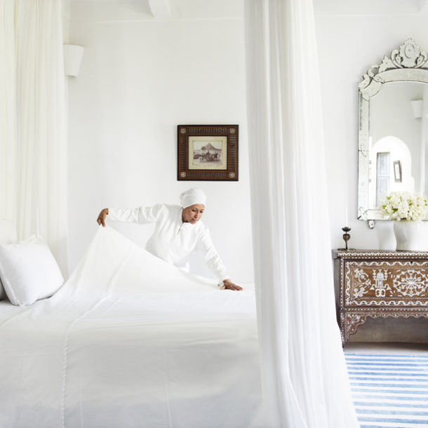The restoration has been executed using local craftsmen and traditional materials. An atmosphere of timeless relaxed grandeur has been created, white voile curtains flow on the terraces giving privacy to the generously proportioned suites. Simple whitewashed walls, high zouak ceilings, warm, soft, restful colours and unfussy decoration give a relaxing feeling of charm and serenity.
