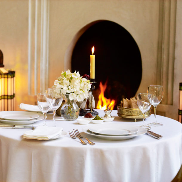 In the evening, dinner can be enjoyed in the dining room. On cooler nights the curtains are drawn and a fire is lit whilst traditional Moroccan food is served. On warmer evenings large glass doors open out onto the courtyard garden allowing the gentle sound of the water fountain and the scents of the garden to flow through rooms.